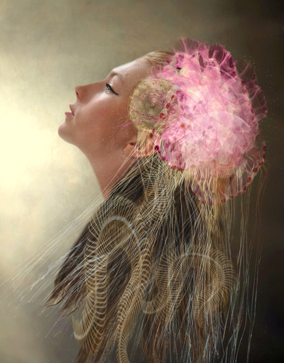 Mensen vragen haar weleens of haar werk geschilderd is. Jo: `Ik begrijp waar de vraag vandaan komt, maar ik werk digitaal. Het startpunt is steevast een foto van een model, dat ik op de computer bewerk tot een wezen uit een andere wereld. Mijn fantasiewereld. Daarvoor gebruik ik bloemen, veren, harnassen en archeologische objecten, kortom: alles wat ik kan gebruiken om tot het gewenste beeld te komen. Als er ook maar één detail is dat me niet bevalt, ga ik net zolang door tot het `klopt'. Vooral het samenvoegen van gezichten waarbij de vrouwenfiguur een amalgaam is van meerdere vrouwen, is tijdrovend. Het is een enorme klus een virtueel gezicht te maken, maar ik houd van het gepriegel, het nauwkeurig op de vierkante centimeter werken.’